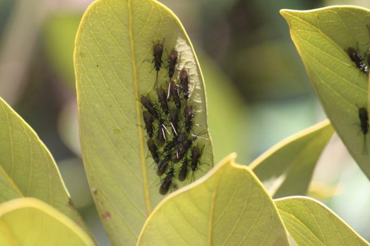 コマユバチの仲間 昆虫に寄生する蜂。寄主の中で育った複数個体が、羽化後纏まって・マテバシイの葉裏で
