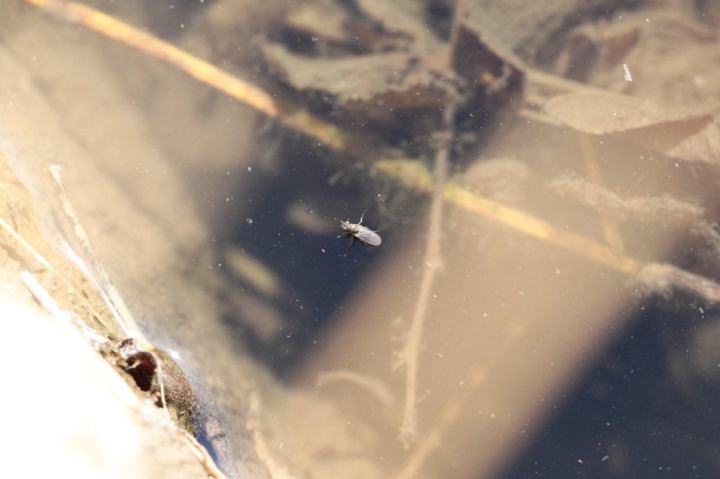 ミギワバエの仲間 「ミギワバエ科」はその名の通り水きわによくいるハエで、アメンボのごとく水面を移動する姿が