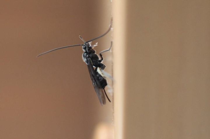 成虫越冬していました。腹部末端より産卵管が認められるのが♀なので、殆どが♀の集団
